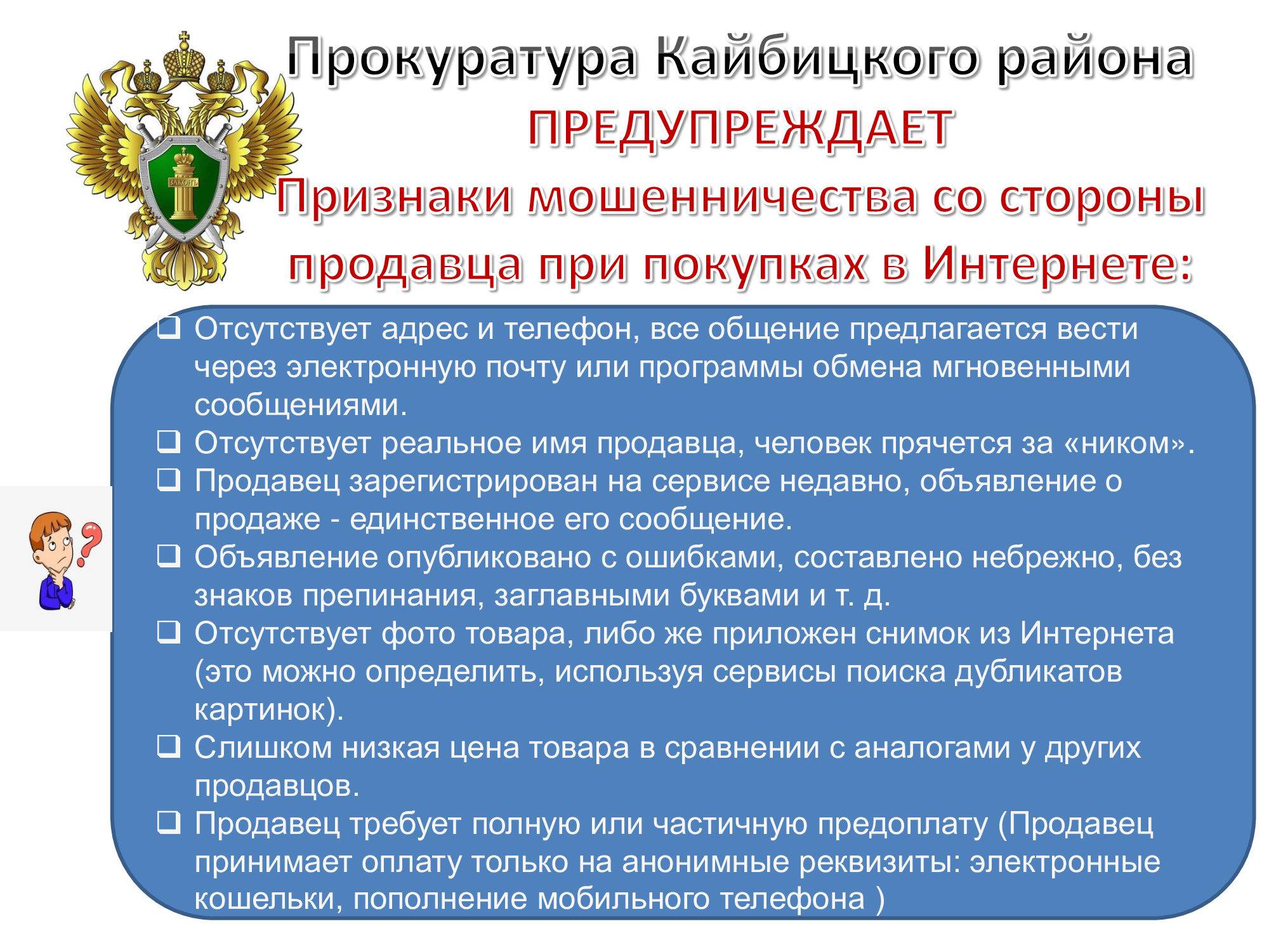 Прокуратура Кайбицкого района ПРЕДУПРЕЖДАЕТ Признаки мошенничества со стороны продавца при покупках в Интернете: