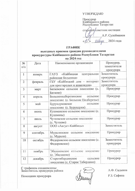 График выездных приемов граждан руководителями прокуратуры Кайбицкого района Республики Татарстан