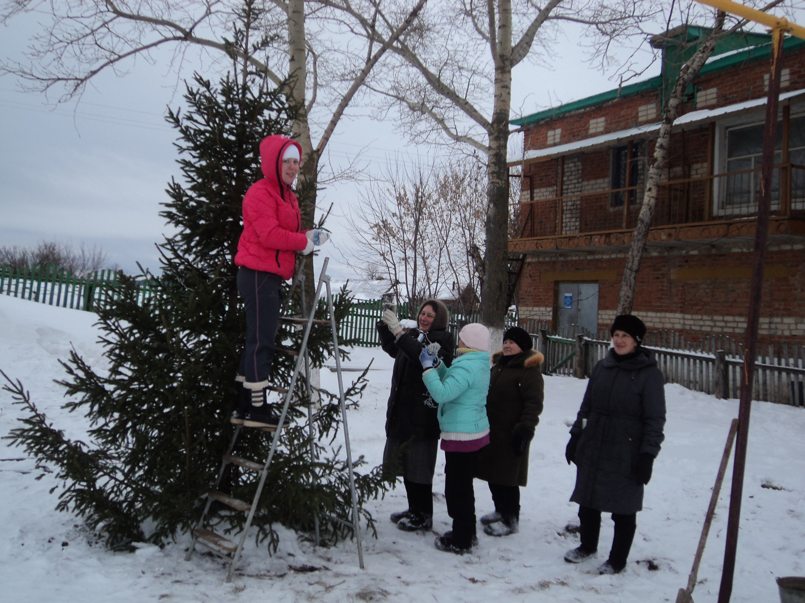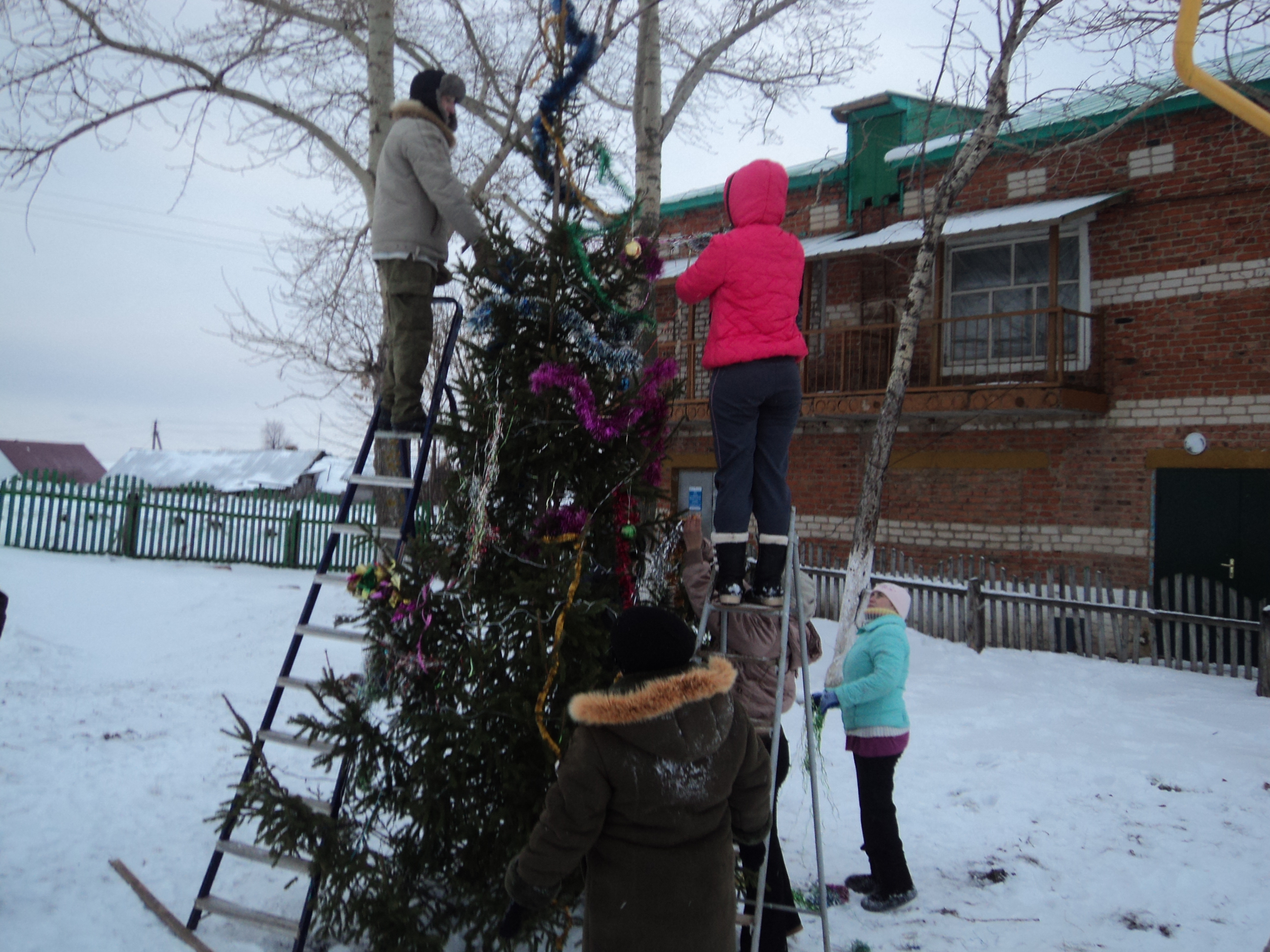 По району объявлен конкурс по украшению территорий учреждений,организаций к новому году.Началась работа и у нас : поставили и украшали елку,повесили гирлянды.